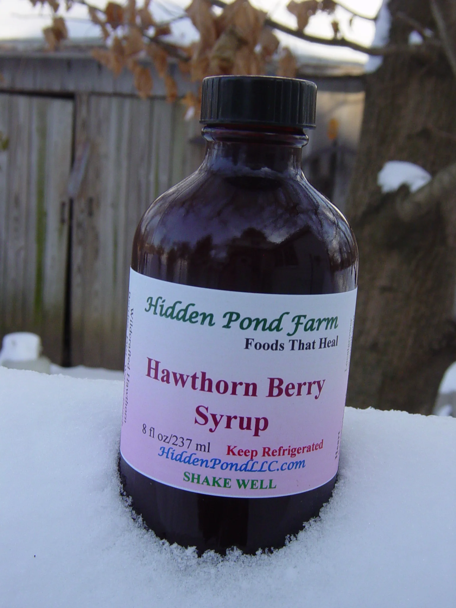 Abington Meadows Hawthorn Berry syrup is made from wildcrafted fresh berries. We simmer the berries in distilled water, strain out the mash and boil the remaining liquid until it has a Brix count of at least 15 . We add vegetable glycerin and a small amount of organic grape alcohol to preserve it. The result is a concentrated, pleasant tasting syrup.